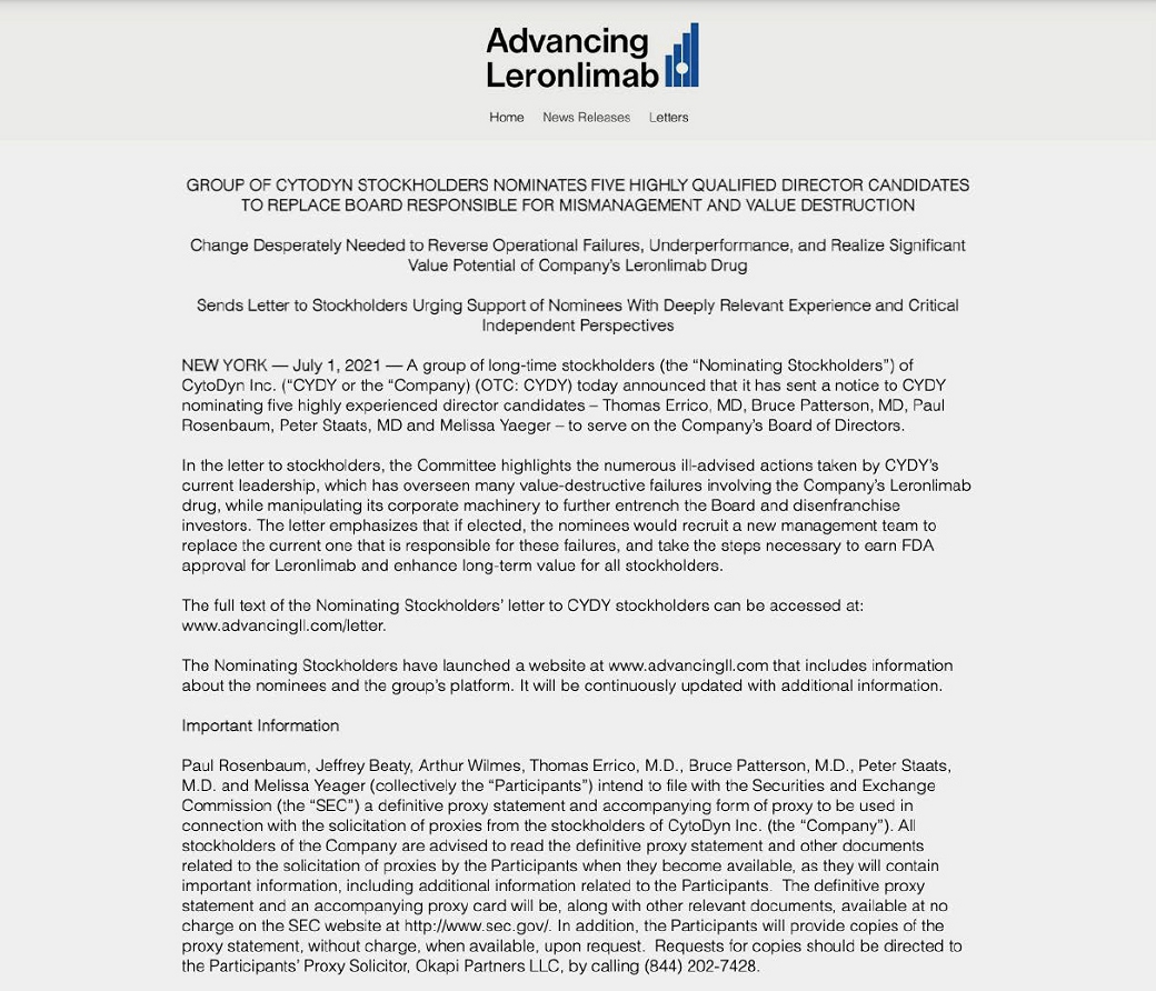 Advancing11 Leronlimab I Home News Releasesletters GROUP OF CYTODYN STOCKHOLD ERS NOMINATES FIVE HIGHLY QUALIFIED DIRECTOR CANDIDATES TO REPLACE BOARD RESPONSIBLE FOR MISMANAGEMENT AND VALUE DESTRUCTION Change Desperately Needed to Reverse Operational Failures, Underperformance, and Realize Significant Value Potential of Company's Leronlimab Drug Sends Letter to Stockholders Urging Support of Nominees With Deeply Relevant Experience and Critical Independent Perspectives NEW YORK -July 1,2021 -A group of long-time stockholders (the "Nominating Stockholders") of CytoDyn Inc. ("CYDY or the "Company) (OTC: CYDY) today announced that it has sent a notice to CYDY nominating five highly experienced director candidates - Thomas Errico, MO, Bruce Patterson, MD, Paul Rosenbaum, Peter Staats, MD and Melissa Yaeger - to serve on the Company's Board of Directors. In the letter to stockholders. the Committee highlights the numerous ill-advised actions taken by CYDY's current leadership,which has overseen numerous value-destructive failures involving the Company's Leronlimab drug, while manipulating its corporate machinery to further entrench the Board and disenfranchise investors. The letter emphasizes that if elected, the nominees would recruit a new management team to replace the current one that is responsible for these failures, and take the steps necessary to earn FDA approval for Leronlimab and enhance long-term value for all stockholders. The full text of the Nominating Stockholders ' letter to CYDY stockholders can be accessed at: www.advancingll.com/letter. The Nominating Stockholders have launched a website at www.advancingll.com that includes information about the nominees and the group's platform. It will be continuously updated with additional information. Important Information Paul Rosenbaum, Jeffrey Beaty, Arthur Wilmes, Thomas Errico, M.O., Bruce Patterson, M.D., Peter Staats, and Melissa Yeager (collectively the "Participants") intend to file with the Securities and Exchange Commission (the "SEC") a definitive proxy statement and accompanying form of proxy to be used in connection with the solicitation of proxies from the stockholders of CytoDyn Inc. (the "Company"). All stockholders of the Company are advised to read the definitive proxy statement and other documents related to the solicitation of proxies by the Participants when they become available, as they will contain important information ,including additional information related to the Participants. The definitive proxy statement and an accompanying proxy card will be, along with other relevant documents, available at no charge on the SEC website at http://www.sec.gov/. In addition, the Participants will provide copies of the proxy statement, without charge, when available, upon request. Requests for copies should be directed to the Participants' Proxy Solicitor, Okapi Partners LLC , by calling (844) 202-7428. |