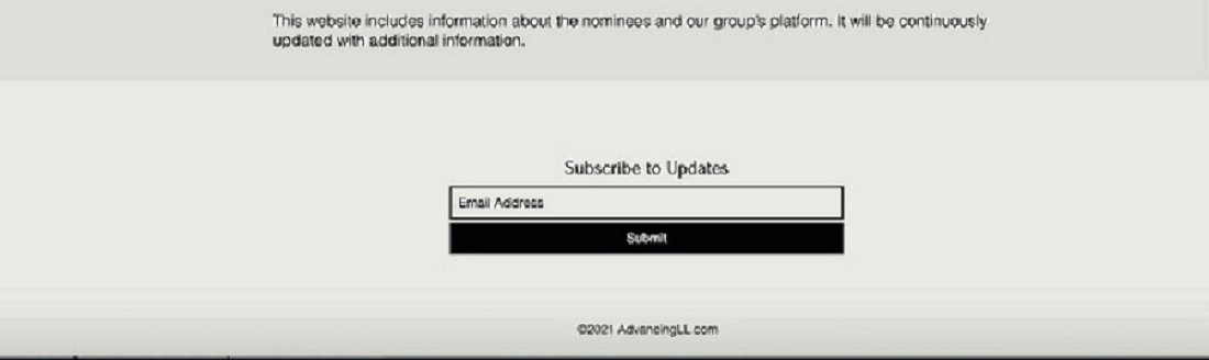 This website includes information about the nominees and our group's platform. It will be continuously updated with additionalinformation. IEmail Address Subscribe to Updates Submit ©2021 AdvancingLL.com |