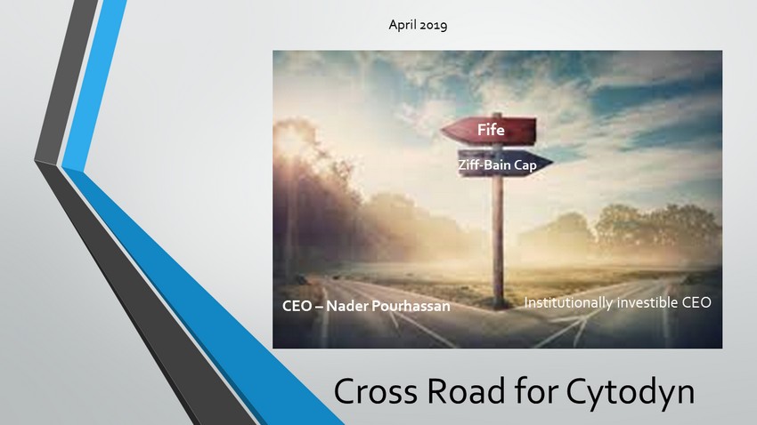 Cross Road for Cytodyn Fife Ziff - Bain Cap CEO – Nader Pourhassan Institutionally investible CEO April 2019