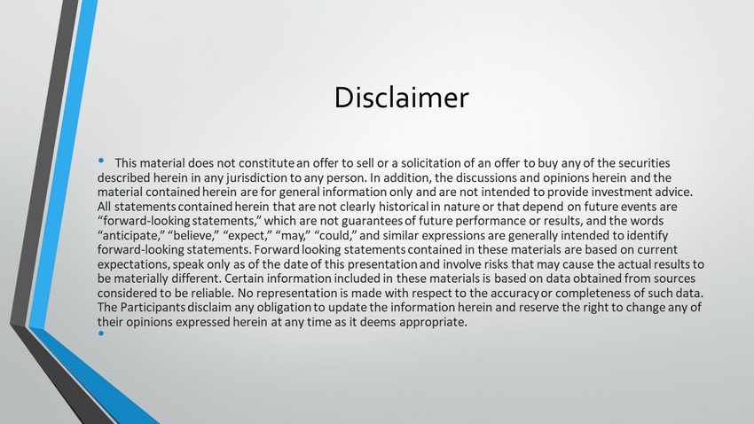 Disclaimer • This material does not constitute an offer to sell or a solicitation of an offer to buy any of the securities described herein in any jurisdiction to any person. In addition, the discussions and opinions herein and the material contained herein are for general information only and are not intended to provide investment advice. All statements contained herein that are not clearly historical in nature or that depend on future events are “forward - looking statements,” which are not guarantees of future performance or results, and the words “anticipate,” “believe,” “expect,” “may,” “could,” and similar expressions are generally intended to identify forward - looking statements. Forward looking statements contained in these materials are based on current expectations, speak only as of the date of this presentation and involve risks that may cause the actual results to be materially different. Certain information included in these materials is based on data obtained from sources considered to be reliable. No representation is made with respect to the accuracy or completeness of such data. The Participants disclaim any obligation to update the information herein and reserve the right to change any of their opinions expressed herein at any time as it deems appropriate. •