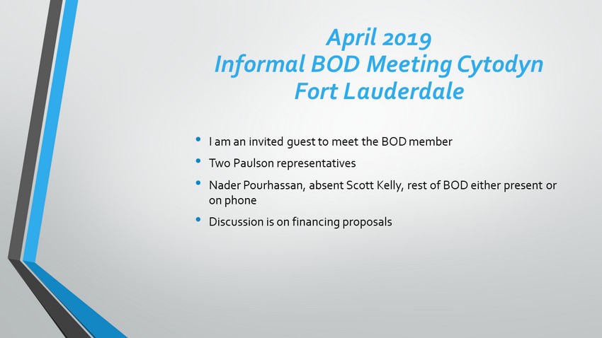 April 2019 Informal BOD Meeting Cytodyn Fort Lauderdale • I am an invited guest to meet the BOD member • Two Paulson representatives • Nader Pourhassan, absent Scott Kelly, rest of BOD either present or on phone • Discussion is on financing proposals