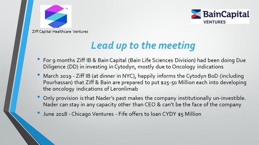 Lead up to the meeting • For 9 months Ziff IB & Bain Capital (Bain Life Sciences Division) had been doing Due Diligence (DD) in investing in Cytodyn, mostly due to Oncology indications • March 2019 - Ziff IB (at dinner in NYC), happily informs the Cytodyn BoD (including Pourhassan) that Ziff & Bain are prepared to put $25 - 50 Million each into developing the oncology indications of Leronlimab • Only provision is that Nader’s past makes the company institutionally un - investible. Nader can stay in any capacity other than CEO & can’t be the face of the company • June 2018 - Chicago Ventures - Fife offers to loan CYDY $5 Million Ziff Capital Healthcare Ventures