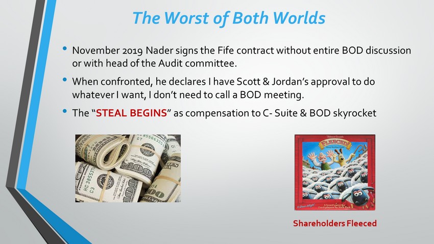 The Worst of Both Worlds • November 2019 Nader signs the Fife contract without entire BOD discussion or with head of the Audit committee. • When confronted, he declares I have Scott & Jordan’s approval to do whatever I want, I don’t need to call a BOD meeting. • The “ STEAL BEGINS ” as compensation to C - Suite & BOD skyrocket Shareholders Fleeced