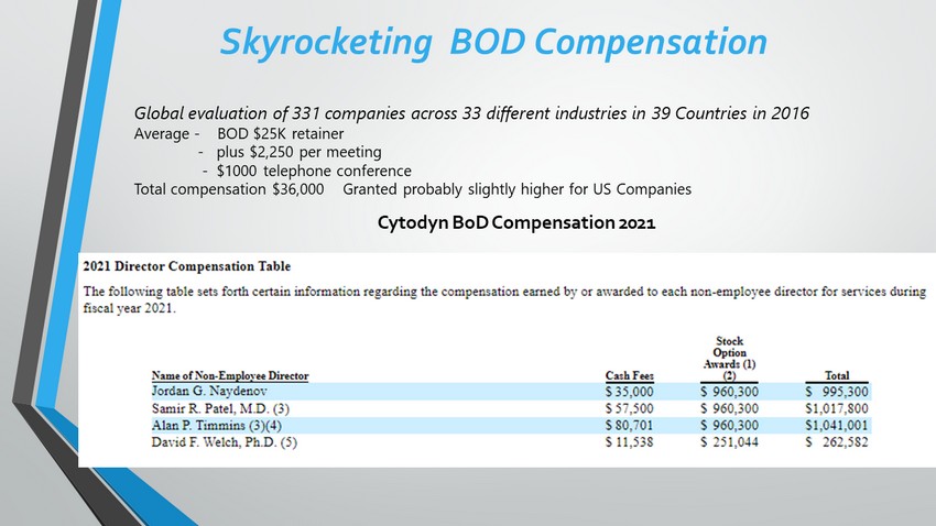 Skyrocketing BOD Compensation Global evaluation of 331 companies across 33 different industries in 39 Countries in 2016 Average - BOD $25K retainer - plus $2,250 per meeting - $1000 telephone conference Total compensation $36,000 Granted probably slightly higher for US Companies Cytodyn BoD Compensation 2021