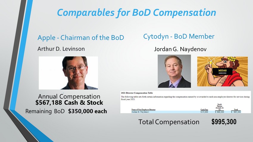 Comparables for BoD Compensation Apple - Chairman of the BoD Arthur D. Levinson • Annual Compensation $567,188 Cash & Stock Remaining BoD $350,000 each Cytodyn - BoD Member Jordan G. Naydenov Total Compensation $995,300