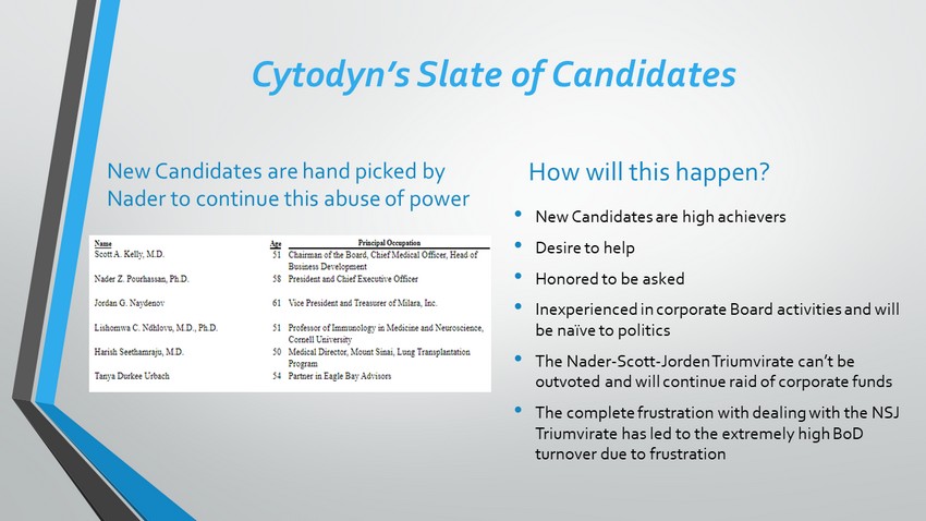 Cytodyn’s Slate of Candidates New Candidates are hand picked by Nader to continue this abuse of power How will this happen? • New Candidates are high achievers • Desire to help • Honored to be asked • Inexperienced in corporate Board activities and will be naïve to politics • The Nader - Scott - Jorden Triumvirate can’t be outvoted and will continue raid of corporate funds • The complete frustration with dealing with the NSJ Triumvirate has led to the extremely high BoD turnover due to frustration