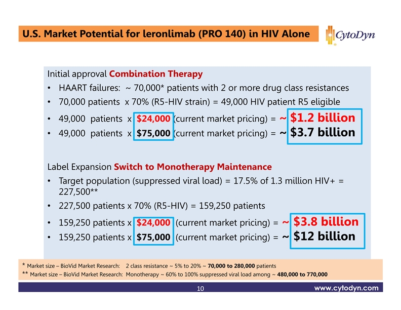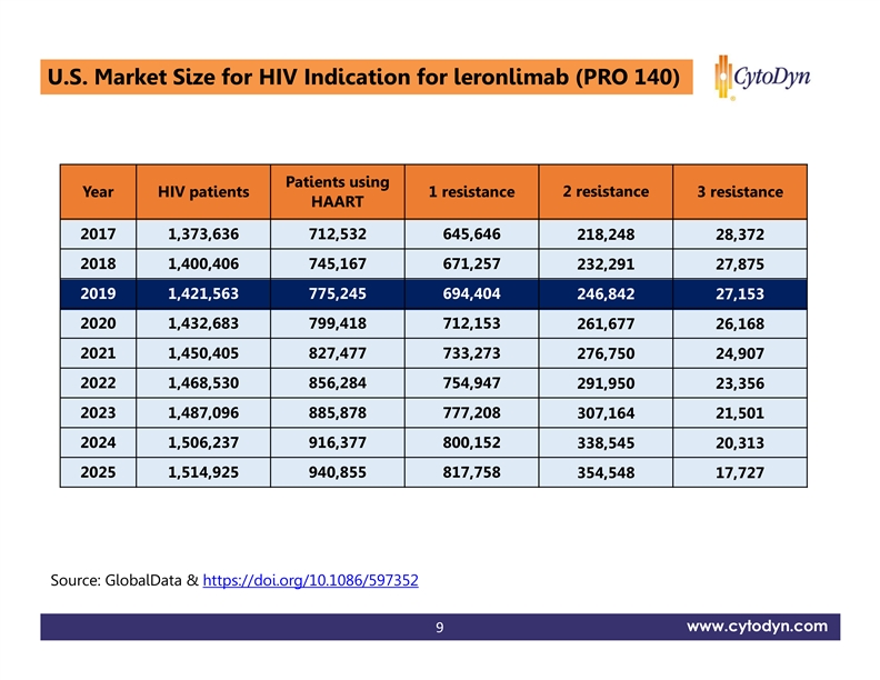 U.S. Market Size for HIV Indication for leronlimab (PRO 140) Patients using Year HIV patients 1 resistance 2 resistance 3 resistance HAART 2017 1,373,636 712,532 645,646 218,248 28,372 2018 1,400,406 745,167 671,257 232,291 27,875 2019 1,421,563 775,245 694,404 246,842 27,153 2020 1,432,683 799,418 712,153 261,677 26,168 2021 1,450,405 827,477 733,273 276,750 24,907 2022 1,468,530 856,284 754,947 291,950 23,356 2023 1,487,096 885,878 777,208 307,164 21,501 2024 1,506,237 916,377 800,152 338,545 20,313 2025 1,514,925 940,855 817,758 354,548 17,727 Source: GlobalData & https://doi.org/10.1086/597352 www.cytodyn.com 9 9U.S. Market Size for HIV Indication for leronlimab (PRO 140) Patients using Year HIV patients 1 resistance 2 resistance 3 resistance HAART 2017 1,373,636 712,532 645,646 218,248 28,372 2018 1,400,406 745,167 671,257 232,291 27,875 2019 1,421,563 775,245 694,404 246,842 27,153 2020 1,432,683 799,418 712,153 261,677 26,168 2021 1,450,405 827,477 733,273 276,750 24,907 2022 1,468,530 856,284 754,947 291,950 23,356 2023 1,487,096 885,878 777,208 307,164 21,501 2024 1,506,237 916,377 800,152 338,545 20,313 2025 1,514,925 940,855 817,758 354,548 17,727 Source: GlobalData & https://doi.org/10.1086/597352 www.cytodyn.com 9 9