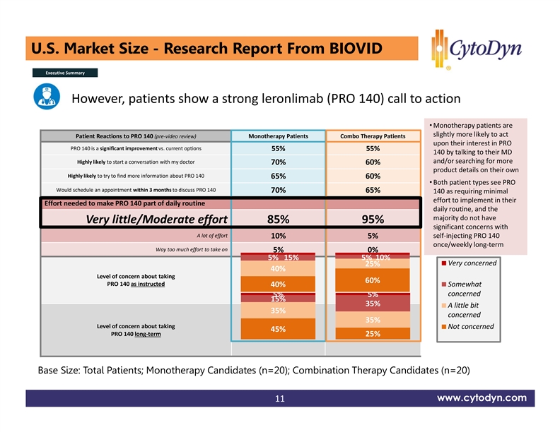 U.S. Market Size - Research Report From BIOVID E Ex xe ec cu ut ti iv ve e S Su um mm ma ar ry y However, patients show a strong leronlimab (PRO 140) call to action • Monotherapy patients are slightly more likely to act Patient Reactions to PRO 140 (pre-video review) Monotherapy Patients Combo Therapy Patients upon their interest in PRO PRO 140 is a significant improvement vs. current options 55% 55% 140 by talking to their MD and/or searching for more Highly likely to start a conversation with my doctor 70% 60% product details on their own Highly likely to try to find more information about PRO 140 65% 60% • Both patient types see PRO Would schedule an appointment within 3 months to discuss PRO 140 70% 65% 140 as requiring minimal effort to implement in their Effort needed to make PRO 140 part of daily routine daily routine, and the majority do not have Very little/Moderate effort 85% 95% significant concerns with A lot of effort self-injecting PRO 140 10% 5% once/weekly long-term Way too much effort to take on 5% 0% 5% 15% 5% 10% Very concerned 25% 40% Level of concern about taking 60% PRO 140 as instructed Somewhat 40% concerned 5% 5% 15% 35% A little bit 35% concerned 35% Level of concern about taking Not concerned 45% PRO 140 long-term 25% 11 Base Size: Total Patients; Monotherapy Candidates (n=20); Combination Therapy Candidates (n=20) (OTCQB: CYDY) www.cytodyn.com www.cytodyn.com 1 11 1U.S. Market Size - Research Report From BIOVID E Ex xe ec cu ut ti iv ve e S Su um mm ma ar ry y However, patients show a strong leronlimab (PRO 140) call to action • Monotherapy patients are slightly more likely to act Patient Reactions to PRO 140 (pre-video review) Monotherapy Patients Combo Therapy Patients upon their interest in PRO PRO 140 is a significant improvement vs. current options 55% 55% 140 by talking to their MD and/or searching for more Highly likely to start a conversation with my doctor 70% 60% product details on their own Highly likely to try to find more information about PRO 140 65% 60% • Both patient types see PRO Would schedule an appointment within 3 months to discuss PRO 140 70% 65% 140 as requiring minimal effort to implement in their Effort needed to make PRO 140 part of daily routine daily routine, and the majority do not have Very little/Moderate effort 85% 95% significant concerns with A lot of effort self-injecting PRO 140 10% 5% once/weekly long-term Way too much effort to take on 5% 0% 5% 15% 5% 10% Very concerned 25% 40% Level of concern about taking 60% PRO 140 as instructed Somewhat 40% concerned 5% 5% 15% 35% A little bit 35% concerned 35% Level of concern about taking Not concerned 45% PRO 140 long-term 25% 11 Base Size: Total Patients; Monotherapy Candidates (n=20); Combination Therapy Candidates (n=20) (OTCQB: CYDY) www.cytodyn.com www.cytodyn.com 1 11 1