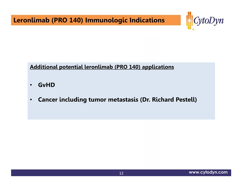 Leronlimab (PRO 140) Immunologic Indications Additional potential leronlimab (PRO 140) applications • GvHD • Cancer including tumor metastasis (Dr. Richard Pestell) www.cytodyn.com 1 12 2Leronlimab (PRO 140) Immunologic Indications Additional potential leronlimab (PRO 140) applications • GvHD • Cancer including tumor metastasis (Dr. Richard Pestell) www.cytodyn.com 1 12 2