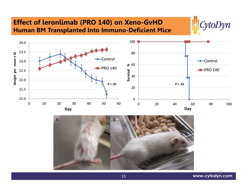 Effect of leronlimab (PRO 140) on Xeno-GvHD Human BM Transplanted Into Immuno-Deficient Mice 100 24.0 23.5 80 Control Control 23.0 60 PRO 140 PRO 140 22.5 40 22.0 P < .01 P < .01 20 21.5 21.0 0 0 10 20 30 40 50 60 0 20 40 60 80 100 Day Day 13 www.cytodyn.com 1 13 3 Weight gm mean ± SE Survival %Effect of leronlimab (PRO 140) on Xeno-GvHD Human BM Transplanted Into Immuno-Deficient Mice 100 24.0 23.5 80 Control Control 23.0 60 PRO 140 PRO 140 22.5 40 22.0 P < .01 P < .01 20 21.5 21.0 0 0 10 20 30 40 50 60 0 20 40 60 80 100 Day Day 13 www.cytodyn.com 1 13 3 Weight gm mean ± SE Survival %