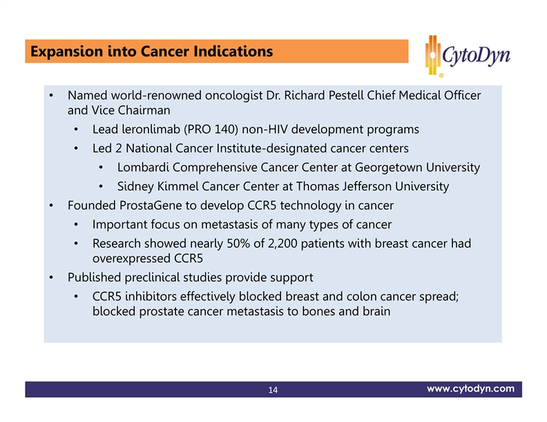 Expansion into Cancer Indications • Named world-renowned oncologist Dr. Richard Pestell Chief Medical Officer and Vice Chairman • Lead leronlimab (PRO 140) non-HIV development programs • Led 2 National Cancer Institute-designated cancer centers • Lombardi Comprehensive Cancer Center at Georgetown University • Sidney Kimmel Cancer Center at Thomas Jefferson University • Founded ProstaGene to develop CCR5 technology in cancer • Important focus on metastasis of many types of cancer • Research showed nearly 50% of 2,200 patients with breast cancer had overexpressed CCR5 • Published preclinical studies provide support • CCR5 inhibitors effectively blocked breast and colon cancer spread; blocked prostate cancer metastasis to bones and brain www.cytodyn.com 1 14 4Expansion into Cancer Indications • Named world-renowned oncologist Dr. Richard Pestell Chief Medical Officer and Vice Chairman • Lead leronlimab (PRO 140) non-HIV development programs • Led 2 National Cancer Institute-designated cancer centers • Lombardi Comprehensive Cancer Center at Georgetown University • Sidney Kimmel Cancer Center at Thomas Jefferson University • Founded ProstaGene to develop CCR5 technology in cancer • Important focus on metastasis of many types of cancer • Research showed nearly 50% of 2,200 patients with breast cancer had overexpressed CCR5 • Published preclinical studies provide support • CCR5 inhibitors effectively blocked breast and colon cancer spread; blocked prostate cancer metastasis to bones and brain www.cytodyn.com 1 14 4