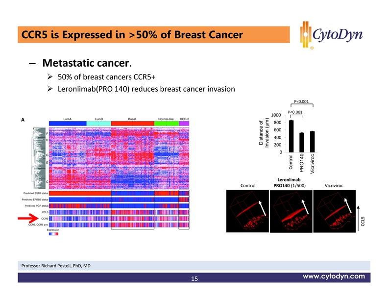 CCR5 is Expressed in >50% of Breast Cancer – Metastatic cancer. Ø 50% of breast cancers CCR5+ Ø Leronlimab(PRO 140) reduces breast cancer invasion P<0.001 P<0.001 1000 800 600 400 200 0 Leronlimab Control PRO140 (1/500) Vicriviroc Professor Richard Pestell, PhD, MD www.cytodyn.com 1 15 5 Distance of Invasion (mm) Control PRO140 Vicriviroc CCL5CCR5 is Expressed in >50% of Breast Cancer – Metastatic cancer. Ø 50% of breast cancers CCR5+ Ø Leronlimab(PRO 140) reduces breast cancer invasion P<0.001 P<0.001 1000 800 600 400 200 0 Leronlimab Control PRO140 (1/500) Vicriviroc Professor Richard Pestell, PhD, MD www.cytodyn.com 1 15 5 Distance of Invasion (mm) Control PRO140 Vicriviroc CCL5