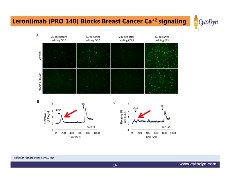 +2 Leronlimab (PRO 140) Blocks Breast Cancer Ca signaling A 20 sec before 60 sec after 240 sec after 60 sec after adding CCL5 adding CCL5 adding CCL5 adding FBS B C FBS 3 3 FBS CCL5 CCL5 2 2 1 1 0 0 Control PRO140 -1 -1 0 200 400 600 800 1000 0 200 400 600 800 1000 Time (Sec) Time (Sec) Professor Richard Pestell, PhD, MD www.cytodyn.com 1 16 6 PRO140 (1/100) Control Relative FI of Fluo-4 Relative FI of Fluo-4+2 Leronlimab (PRO 140) Blocks Breast Cancer Ca signaling A 20 sec before 60 sec after 240 sec after 60 sec after adding CCL5 adding CCL5 adding CCL5 adding FBS B C FBS 3 3 FBS CCL5 CCL5 2 2 1 1 0 0 Control PRO140 -1 -1 0 200 400 600 800 1000 0 200 400 600 800 1000 Time (Sec) Time (Sec) Professor Richard Pestell, PhD, MD www.cytodyn.com 1 16 6 PRO140 (1/100) Control Relative FI of Fluo-4 Relative FI of Fluo-4