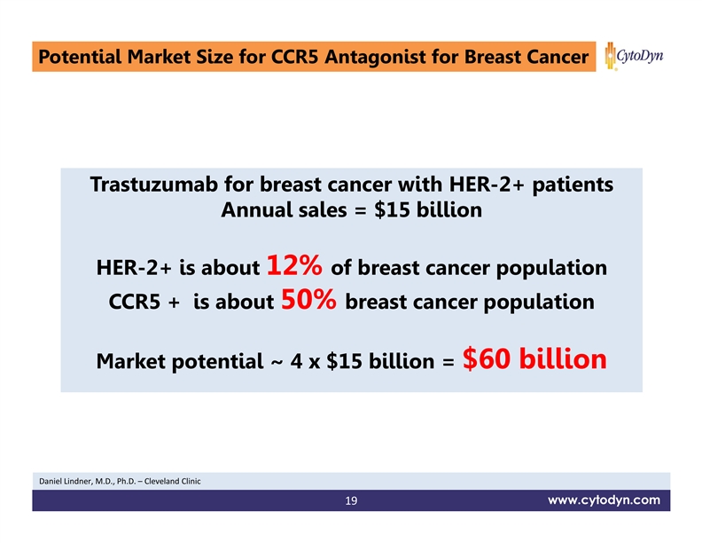 Potential Market Size for CCR5 Antagonist for Breast Cancer Trastuzumab for breast cancer with HER-2+ patients Annual sales = $15 billion HER-2+ is about 12% of breast cancer population CCR5 + is about 50% breast cancer population Market potential ~ 4 x $15 billion = $60 billion Daniel Lindner, M.D., Ph.D. – Cleveland Clinic www.cytodyn.com 1 19 9Potential Market Size for CCR5 Antagonist for Breast Cancer Trastuzumab for breast cancer with HER-2+ patients Annual sales = $15 billion HER-2+ is about 12% of breast cancer population CCR5 + is about 50% breast cancer population Market potential ~ 4 x $15 billion = $60 billion Daniel Lindner, M.D., Ph.D. – Cleveland Clinic www.cytodyn.com 1 19 9