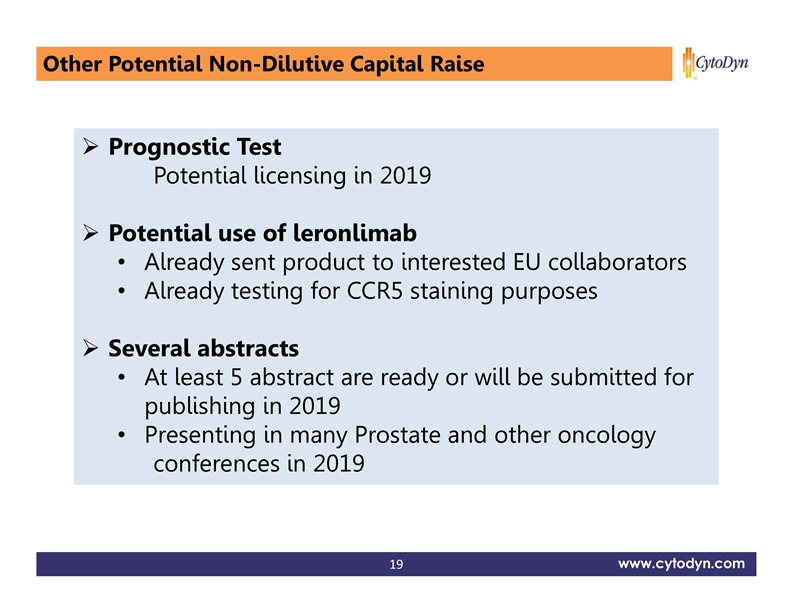 Other Potential Non-Dilutive Capital Raise Ø Prognostic Test Potential licensing in 2019 Ø Potential use of leronlimab • Already sent product to interested EU collaborators • Already testing for CCR5 staining purposes Ø Several abstracts • At least 5 abstract are ready or will be submitted for publishing in 2019 • Presenting in many Prostate and other oncology conferences in 2019 www.cytodyn.com 1 19 9Other Potential Non-Dilutive Capital Raise Ø Prognostic Test Potential licensing in 2019 Ø Potential use of leronlimab • Already sent product to interested EU collaborators • Already testing for CCR5 staining purposes Ø Several abstracts • At least 5 abstract are ready or will be submitted for publishing in 2019 • Presenting in many Prostate and other oncology conferences in 2019 www.cytodyn.com 1 19 9