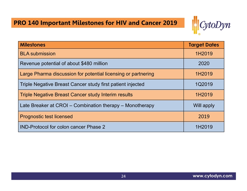 PRO 140 Important Milestones for HIV and Cancer 2019 Milestones Target Dates BLA submission 1H2019 Revenue potential of about $480 million 2020 Large Pharma discussion for potential licensing or partnering 1H2019 Triple Negative Breast Cancer study first patient injected 1Q2019 Triple Negative Breast Cancer study Interim results 1H2019 Late Breaker at CROI – Combination therapy – Monotherapy Will apply Prognostic test licensed 2019 IND-Protocol for colon cancer Phase 2 1H2019 www.cytodyn.com 2 24 4PRO 140 Important Milestones for HIV and Cancer 2019 Milestones Target Dates BLA submission 1H2019 Revenue potential of about $480 million 2020 Large Pharma discussion for potential licensing or partnering 1H2019 Triple Negative Breast Cancer study first patient injected 1Q2019 Triple Negative Breast Cancer study Interim results 1H2019 Late Breaker at CROI – Combination therapy – Monotherapy Will apply Prognostic test licensed 2019 IND-Protocol for colon cancer Phase 2 1H2019 www.cytodyn.com 2 24 4
