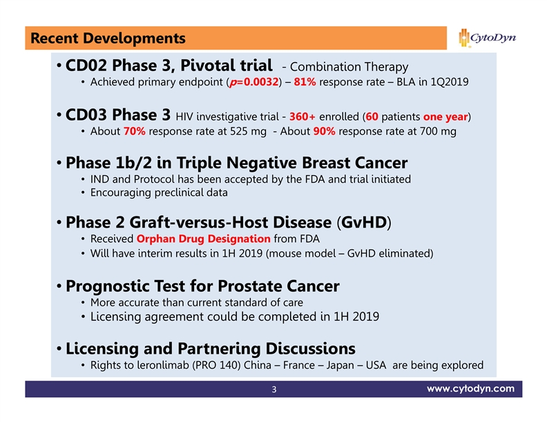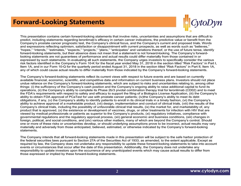 Forward-Looking Statements This presentation contains certain forward-looking statements that involve risks, uncertainties and assumptions that are difficult to predict, including statements regarding leronlimab’s efficacy in certain cancer indications, the predictive value or benefit from the Company’s prostate cancer prognostic test, the Company’s clinical focus, and the Company’s current and proposed trials. Words and expressions reflecting optimism, satisfaction or disappointment with current prospects, as well as words such as “believes,” “hopes,” “intends,” “estimates,” “expects,” “projects,” “plans,” “anticipates” and variations thereof, or the use of future tense, identify forward-looking statements, but their absence does not mean that a statement is not forward-looking. The Company’s forward- looking statements are not guarantees of performance and actual results could differ materially from those contained in or expressed by such statements. In evaluating all such statements, the Company urges investors to specifically consider the various risk factors identified in the Company’s Form 10-K for the fiscal year ended May 31, 2018 in the section titled “Risk Factors” in Part I, Item 1A, and in our Form 10-Q for the quarterly period ended August 31, 2018 in the section titled “Risk Factors” in Part II, Item 1A, any of which could cause actual results to differ materially from those indicated by the Company’s forward-looking statements. The Company’s forward-looking statements reflect its current views with respect to future events and are based on currently available financial, economic, scientific, and competitive data and information on current business plans. Investors should not place undue reliance on the Company’s forward-looking statements, which are subject to risks and uncertainties relating to, among other things: (i) the sufficiency of the Company’s cash position and the Company’s ongoing ability to raise additional capital to fund its operations, (ii) the Company’s ability to complete its Phase 2b/3 pivotal combination therapy trial for leronlimab (CD02) and to meet the FDA’s requirements with respect to safety and efficacy to support the filing of a Biologics License Application, (iii) the Company's ability to obtain FDA approval of PCaTest for use with prostate cancer patients; (iv)the Company’s ability to meet its debt obligations, if any, (v) the Company’s ability to identify patients to enroll in its clinical trials in a timely fashion, (vi) the Company’s ability to achieve approval of a marketable product, (vii) design, implementation and conduct of clinical trials, (viii) the results of the Company’s clinical trials, including the possibility of unfavorable clinical trial results, (ix) the market for, and marketability of, any product that is approved, (x) the existence or development of vaccines, drugs, or other treatments for infection with HIV that are viewed by medical professionals or patients as superior to the Company’s products, (xi) regulatory initiatives, compliance with governmental regulations and the regulatory approval process, (xii) general economic and business conditions, (xiii) changes in foreign, political, and social conditions, and (xiv) various other matters, many of which are beyond the Company’s control. Should one or more of these risks or uncertainties develop, or should underlying assumptions prove to be incorrect, actual results may vary materially and adversely from those anticipated, believed, estimated, or otherwise indicated by the Company’s forward-looking statements. The Company intends that all forward-looking statements made in this presentation will be subject to the safe harbor protection of the federal securities laws pursuant to Section 27A of the Securities Act of 1933, as amended, to the extent applicable. Except as required by law, the Company does not undertake any responsibility to update these forward-looking statements to take into account events or circumstances that occur after the date of this presentation. Additionally, the Company does not undertake any responsibility to update investors upon the occurrence of any unanticipated events which may cause actual results to differ from those expressed or implied by these forward-looking statements. www.cytodyn.com 2 www.cytodyn.comForward-Looking Statements This presentation contains certain forward-looking statements that involve risks, uncertainties and assumptions that are difficult to predict, including statements regarding leronlimab’s efficacy in certain cancer indications, the predictive value or benefit from the Company’s prostate cancer prognostic test, the Company’s clinical focus, and the Company’s current and proposed trials. Words and expressions reflecting optimism, satisfaction or disappointment with current prospects, as well as words such as “believes,” “hopes,” “intends,” “estimates,” “expects,” “projects,” “plans,” “anticipates” and variations thereof, or the use of future tense, identify forward-looking statements, but their absence does not mean that a statement is not forward-looking. The Company’s forward- looking statements are not guarantees of performance and actual results could differ materially from those contained in or expressed by such statements. In evaluating all such statements, the Company urges investors to specifically consider the various risk factors identified in the Company’s Form 10-K for the fiscal year ended May 31, 2018 in the section titled “Risk Factors” in Part I, Item 1A, and in our Form 10-Q for the quarterly period ended August 31, 2018 in the section titled “Risk Factors” in Part II, Item 1A, any of which could cause actual results to differ materially from those indicated by the Company’s forward-looking statements. The Company’s forward-looking statements reflect its current view