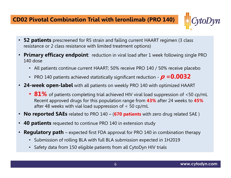 FDA: “fast track designation” – “accelerated approval” NIH: $28 million grants BECAUSE Leronlimab HAART (PRO 140) No serious side effects and Ranges from mild to severe Side Effects no serious adverse events (SAEs) (Diarrhea, nausea, lethargy, in >670 patients in 8 clinical trials depression) Toxicity Problems with short- and Negligible toxicity long-term toxicity No drug resistance in patients 76% of HIV patients have Resistance on monotherapy for over 4 years at least one resistance Daily lifetime dosing with Weekly, easy, subcutaneous only 35% of patients with Compliance self administration complete viral load suppression www.cytodyn.com 5 5FDA: “fast track designation” – “accelerated approval” NIH: $28 million grants BECAUSE Leronlimab HAART (PRO 140) No serious side effects and Ranges from mild to severe Side Effects no serious adverse events (SAEs) (Diarrhea, nausea, lethargy, in >670 patients in 8 clinical trials depression) Toxicity Problems with short- and Negligible toxicity long-term toxicity No drug resistance in patients 76% of HIV patients have Resistance on monotherapy for over 4 years at least one resistance Daily lifetime dosing with Weekly, easy, subcutaneous only 35% of patients with Compliance self administration complete viral load suppression www.cytodyn.com 5 5