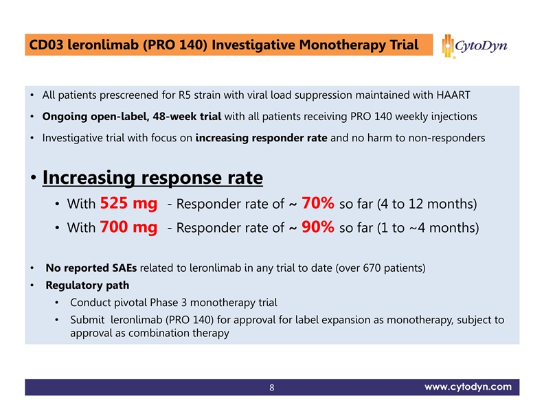 Potential Approval for leronlimab (PRO 140) in HIV • Timeline for submitting rolling BLA • Non-Clinical - Completed • Clinical - 1Q19 • CMC (Manufacturing) - 1Q19 • Final Complete package: 1Q19 www.cytodyn.com 7 7Potential Approval for leronlimab (PRO 140) in HIV • Timeline for submitting rolling BLA • Non-Clinical - Completed • Clinical - 1Q19 • CMC (Manufacturing) - 1Q19 • Final Complete package: 1Q19 www.cytodyn.com 7 7